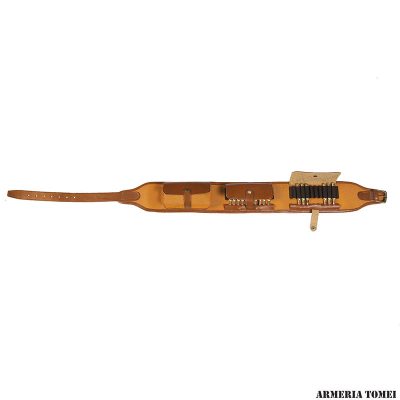 Cartuccera in cordura dupont per carabina con attacchi e inserti in pelle. 2 patte con 10 celle elastiche cadauna con para ogiva. Porta caricatore con pattina in pelle e chiusura a bottone a pressione. Fibbia a rullo fissata con cuciture. Dimensioni: spessore pelle mm 2,8-3,0, larghezza mm 32, lunghezza max cm 125. Colore orange. Made in Italy. La colorazione della pelle, essendo eseguita in maniera naturale, può subire delle leggere variazioni di tonalità.