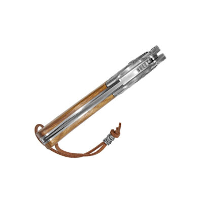 La lama è realizzata in acciaio inossidabile 3Cr13Mov ed è dotata di una scanalatura per l’unghia per facilitarne l’apertura. In posizione aperta, la lama è bloccata da un meccanismo di bloccaggio dorsale. Gli inserti e le finiture del manico sono in acciaio, mentre il manico è in legno di zebrano.