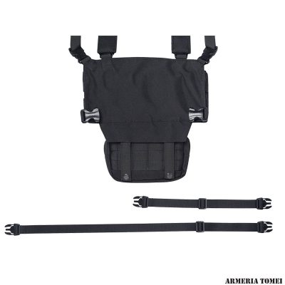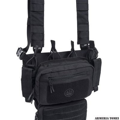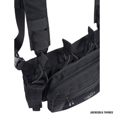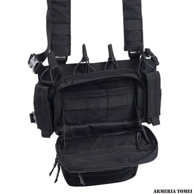 Tactical Chest Rig realizzato in materiale ripstop ad alta resistenza. Il chest rig può ospitare fino a 4 caricatori di tipo STANAG e 2 caricatori per pistola. Il design con interfaccia M.O.L.L.E. permette all’utilizzatore di personalizzare il chest rig a seconda delle proprie esigenze. Grande tasca multiuso posizionata nella parte frontale e pouch rimovibile nella parte inferiore. Il chest rig è fornito di due cinghie di fissaggio regolabili di differente lunghezza per garantire massima vestibilità dell’accessorio.
