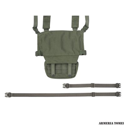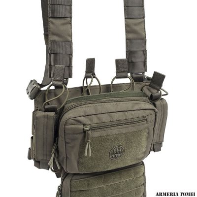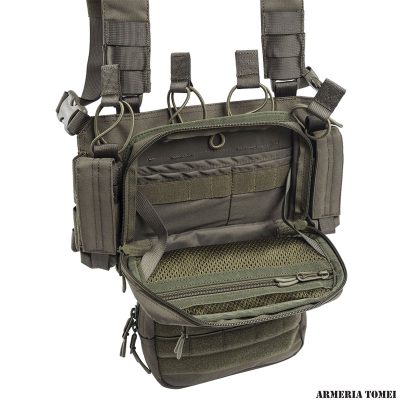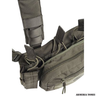 Tactical Chest Rig realizzato in materiale ripstop ad alta resistenza. Il chest rig può ospitare fino a 4 caricatori di tipo STANAG e 2 caricatori per pistola. Il design con interfaccia M.O.L.L.E. permette all’utilizzatore di personalizzare il chest rig a seconda delle proprie esigenze. Grande tasca multiuso posizionata nella parte frontale e pouch rimovibile nella parte inferiore. Il chest rig è fornito di due cinghie di fissaggio regolabili di differente lunghezza per garantire massima vestibilità dell’accessorio.