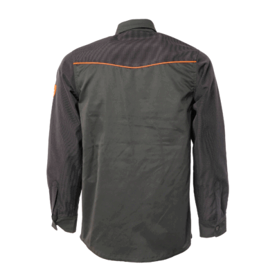 Camicia da caccia in poly-cotone verde, leggero e resistente, per tutti i tipi di uso. Con rinforzi in tessuto tecnico impermeabile e anti spino. Due comode tasche con bottone. Dettagli alta visibilità.