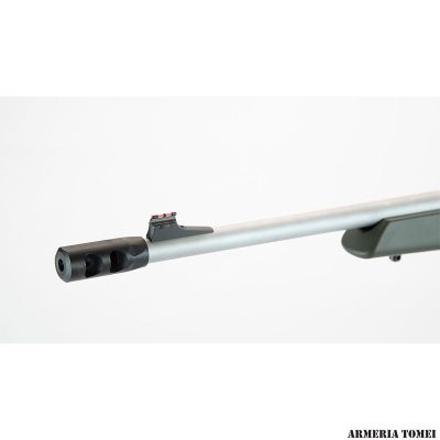 La canna della Sabatti Rover Alaskan è dotata di mire metalliche con mirino in fibra ottica, ha un diametro in volata di 18 mm (.71”), finitura Cerakote e termina con un freno di bocca montato su una filettatura 5/8”-24 UNEF.