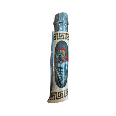 Realizzato a mano da un artigiano della nostra zona. Lama incisa a mano, il manico nel lato sinistro è stato scavato per riprodurci una scena di uno spartano. Nel lato destro invece, vi è inciso uno spartano con l’elmo. Lama incisa con leone. Il tutto lavorato completamente a mano.