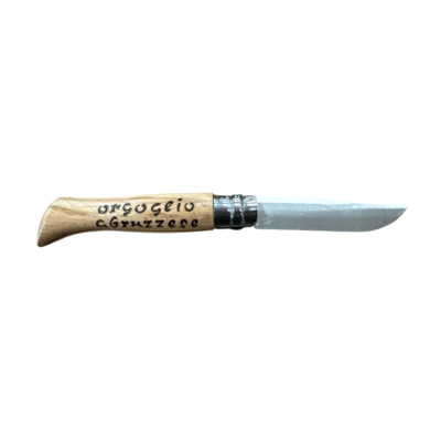 Realizzato a mano da un artigiano della nostra zona. Lama incisa a mano, il manico nel lato sinistro è stato scavato per riprodurci un pastore Abruzzese, nel lato destro invece, vi è incisa una frase “orgoglio abruzzese”. Il tutto lavorato completamente a mano. Splendido.
