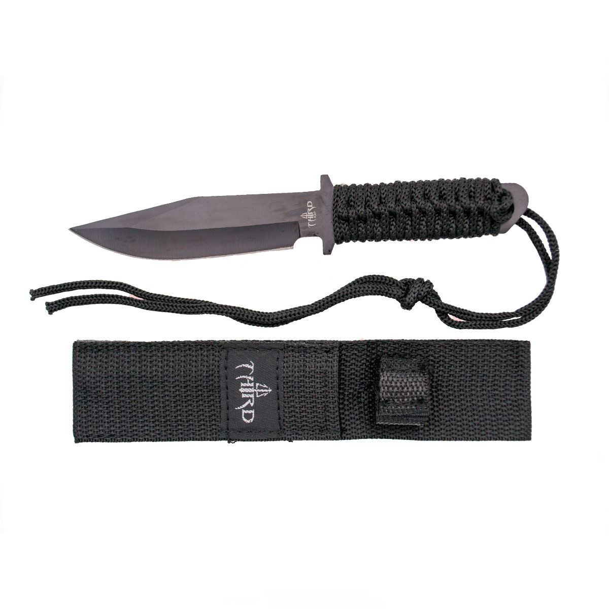 Third coltello tattico H0600 con lama in acciaio nero da 11 cm, impugnatura in corda nera e fodero in nylon nero. Rif. H0600