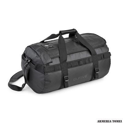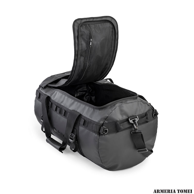 La Duffle bag è realizzata in materiale impermeabile, ha una classica forma tubolare con ampia apertura superiore, una tasca interna a rete sotto la patta ed una esterna nella parte frontale, adatta a molteplici usi ed apprezzata dai viaggiatori per la sua ergonomia e capienza.