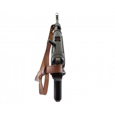 Riproduzione di fucile mitragliatore, realizzato in metallo e plastica, con meccanismo di caricamento e sparo simulatore, caricatore rimovibile e cinturino regolabile in pelle.