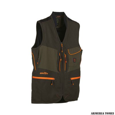 Gilet da caccia ALPI in nylon micro-ripstop elasticizzato, leggero e confortevole per agevolare il movimento. Rinforzi in tessuto GR-TEX nei punti di maggiore usura. Sei tasche frontali con chiusura a zip, tasca porta satellitare, ampio carniere staccabile su cui è applicata doppia tasca con elastico, tasca interna porta documenti.