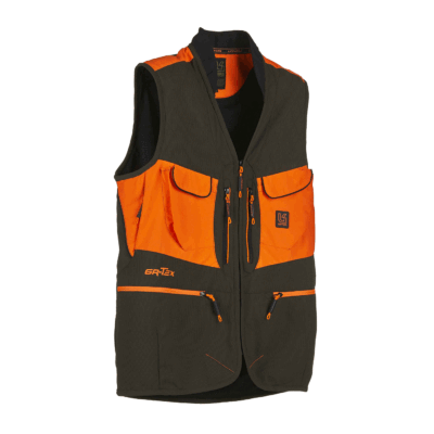 Gilet da caccia ALPI in nylon micro-ripstop elasticizzato, leggero e confortevole per agevolare il movimento. Rinforzo in tessuto GR-TEX e parti in arancione fluorescente per essere visibili in ogni condizione. Sei tasche frontali con chiusura a zip, due tasche porta satellitare, ampio carniere staccabile su cui è applicata doppia tasca con elastico, tasca interna porta documenti.