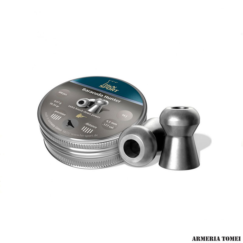 Pallino da caccia pesante straordinariamente preciso per lunghe distanze. Design „baracuda“ di nuova progettazione con ottime caratteristiche aerodinamiche per massima forza d‘impatto, elevata profondità di penetrazione e deformazione controllata del proiettile. Rosata concentrata. Liscio con punta cava profonda.
