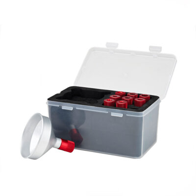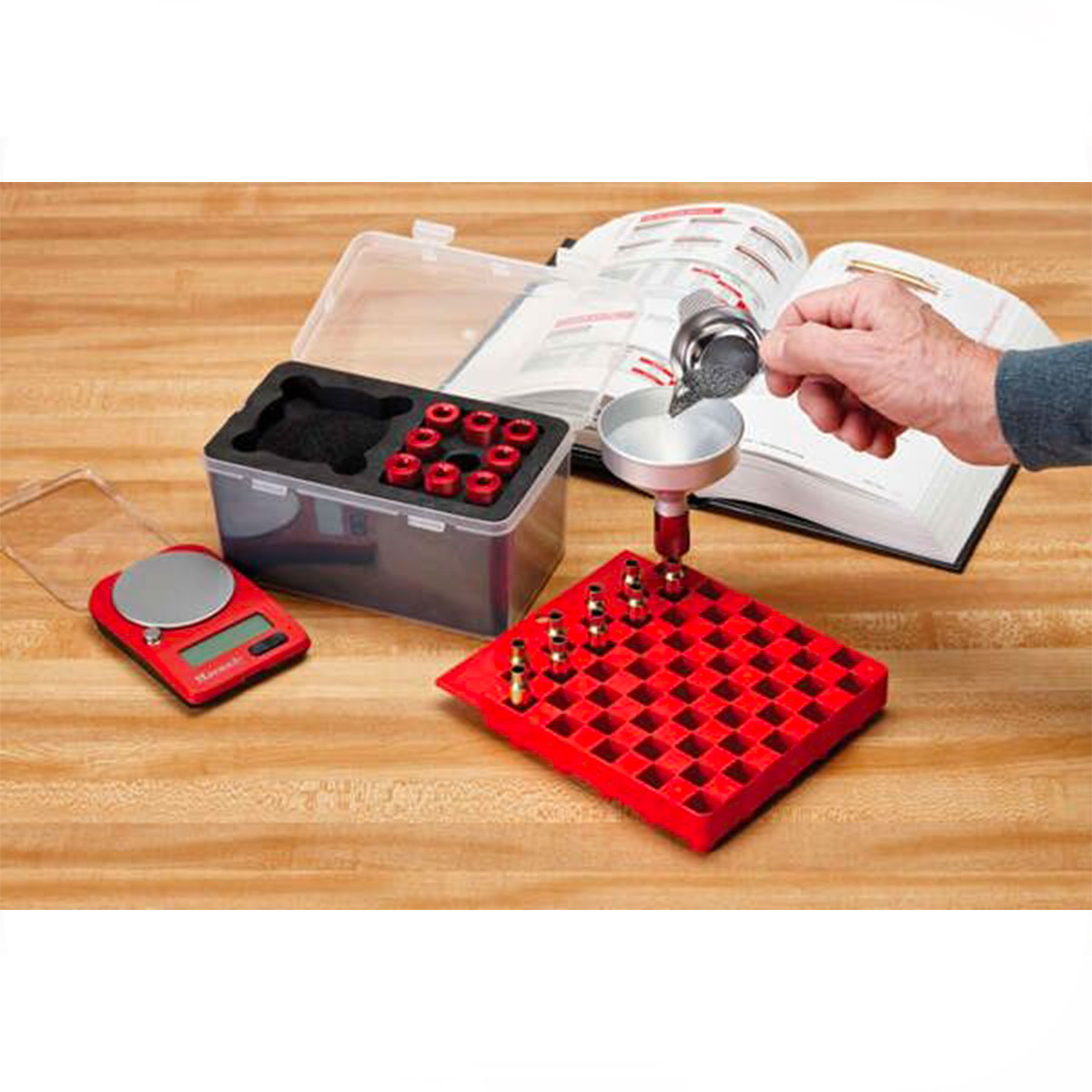 Imbuto in alluminio ad alta capacità e antistatico, comodamente riponibile nell’apposita custodia sagomata. Include nove boccole specifiche per calibro, che permettono all’imbuto di adattarsi a una vasta gamma di bossoli: .224, .243/6mm, .257, .264/6.5mm, .277/6.8mm, .284/7mm, .308, .338, .375