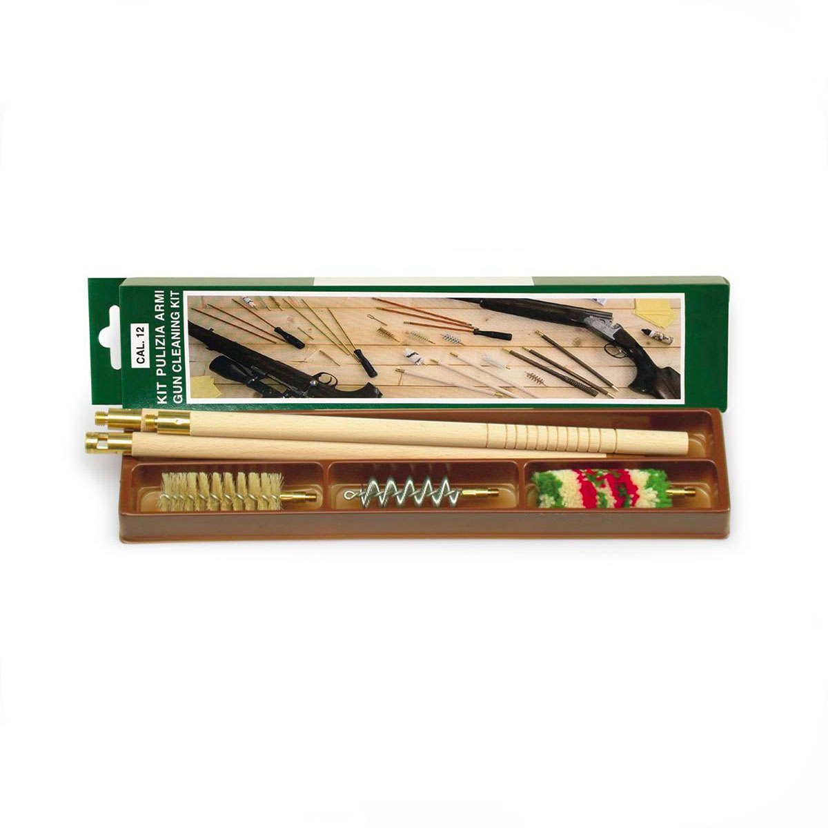 KIT PULIZIA FUCILE IN SCAT. DI CART. LUC. C/BACCHET. LEGNO VERNIC. A 3 PEZZI, DIAM. 13 MM, SCOVOLI LANA, SETOLA E ACCIAIO A ELICA
