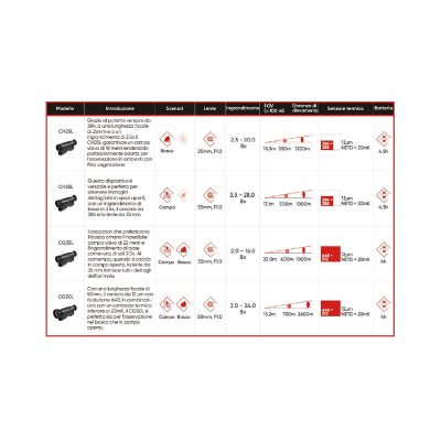 - Campo visivo (H × V), gradi/m a 100 m 7,5° x 5,6° / 13,1 x 9,7 m a 100 m