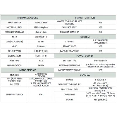 caratteristiche uniche come: 4 diverse palettes, Wi-Fi hotspot, funzione di registrazione foto e video, allarme incendi e così via. Include anche un punto rosso per inquadrare più