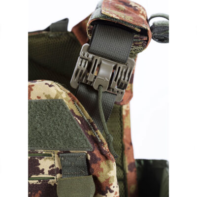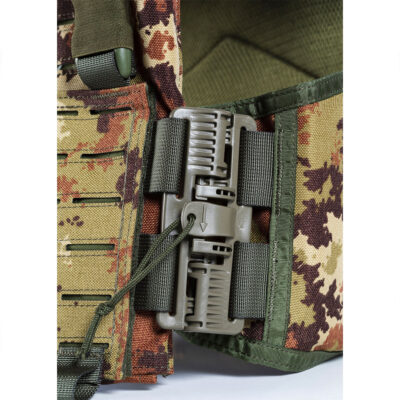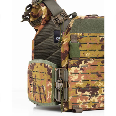 Grazie al sistema MOLLE laser cut, è possibile configurare il setup secondo le esigenze operative, distribuendo tasche, pouch o accessori su tutto il perimetro del plate carrier, sia sul fronte che sul retro. Il pannello frontale removibile, fissato tramite velcro e clip, permette un rapido cambio di configurazione senza perdere tempo.