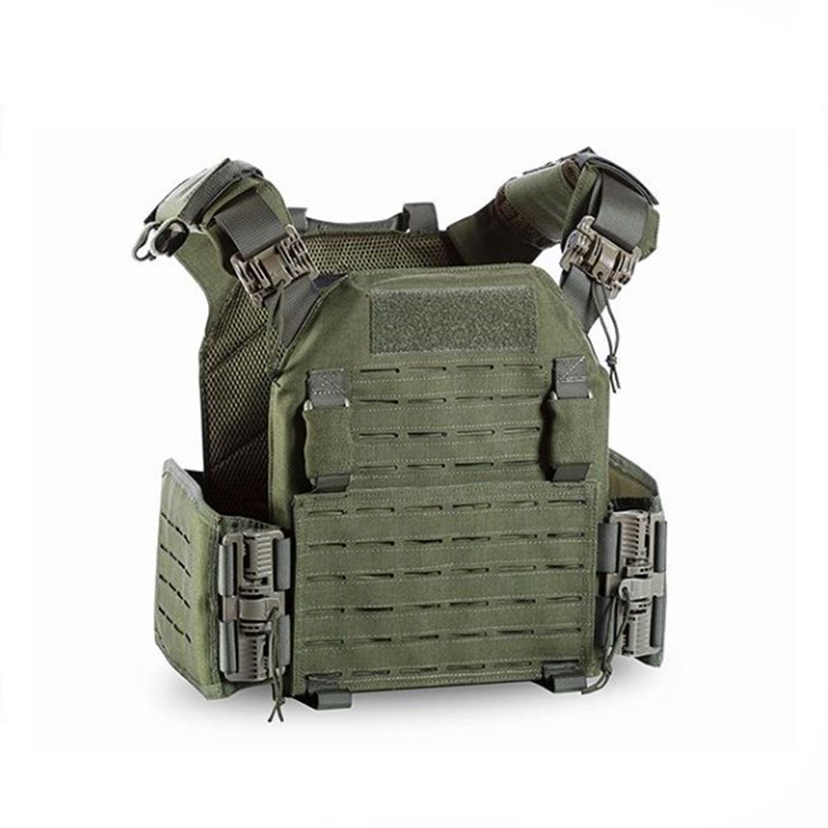 Grazie al sistema MOLLE laser cut, è possibile configurare il setup secondo le esigenze operative, distribuendo tasche, pouch o accessori su tutto il perimetro del plate carrier, sia sul fronte che sul retro. Il pannello frontale removibile, fissato tramite velcro e clip, permette un rapido cambio di configurazione senza perdere tempo.