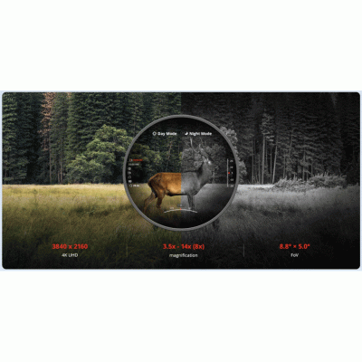 HIKMICRO ALPEX 4K, dotato di un rilevatore CMOS ad altissima definizione da 3840 x 2160, offre dettagli d’immagine straordinari e senza precedenti tutto il giorno. Con un ingrandimento di base di 3,5x e un campo visivo di 15,3 m a 100 m, mostra un’eccezionale capacità di rilevamento e identificazione dei bersagli nell’intera gamma di ingrandimenti.