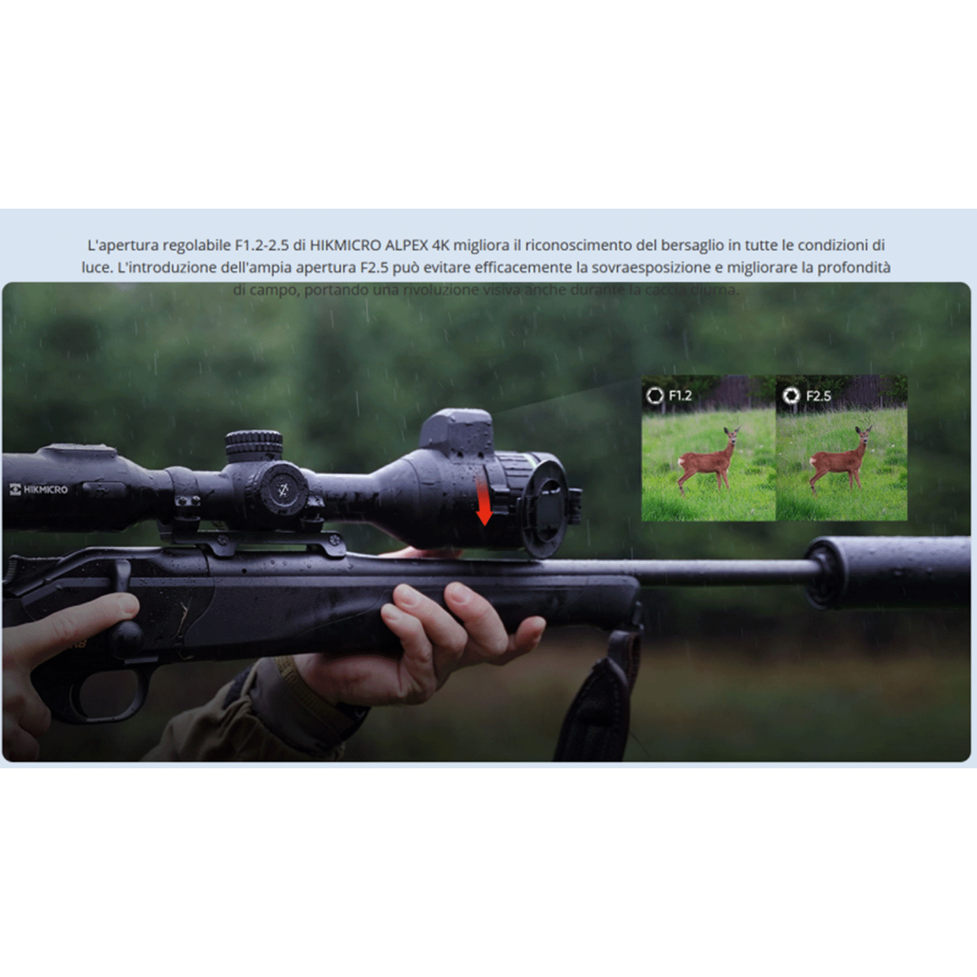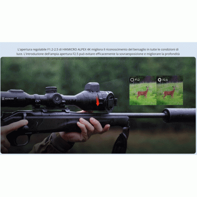 L’apertura regolabile F1.2-2.5 di HIKMICRO ALPEX 4K migliora il riconoscimento del bersaglio in tutte le condizioni di luce. L’introduzione dell’ampia apertura F2.5 può evitare efficacemente la sovraesposizione e migliorare la profondità di campo, portando una rivoluzione visiva anche durante la caccia diurna.