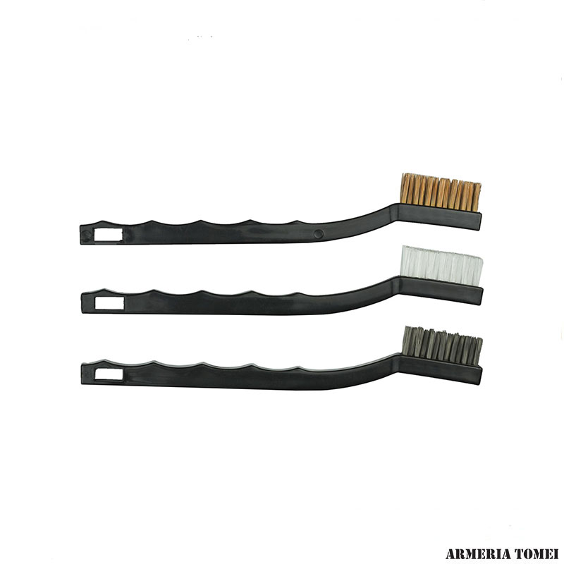 Questo set di 3 spazzole in grado di gestire praticamente qualsiasi lavoro di pulizia: c’è una spazzola in nylon per parti delicate e incise, una spazzola in bronzo fosforoso per una pulizia aggressiva dell’acciaio brunito e una spazzola in acciaio inossidabile per i lavori pesanti, come la culatta / bullone la zona.