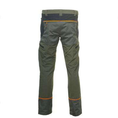 Pantalone in tessuto rip-stop elasticizzato verde/fluo arancio idrorepellente con protezioni in tessuto tecnico sulle ginocchia sul sedere e sul fondo gamba, 2 tasche frontali con zip 2 tasconi a taglio con zip 2 tasche dietro con zip.