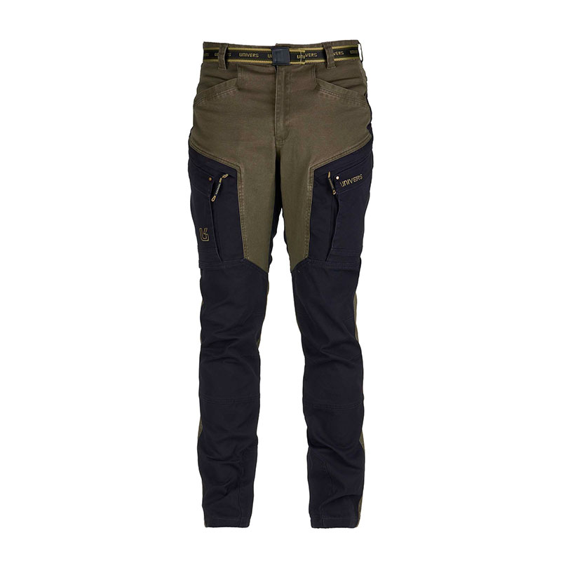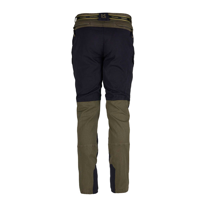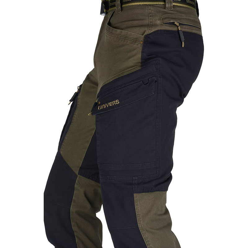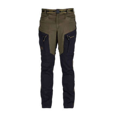 Pantalone da caccia SATURNIA, pratico e funzionale, in robusto canvas di cotone elasticizzato con trattamento stone washed. Due tasche frontali, doppie tasche laterali una a scomparsa con zip sui cui è applicata tasca a soffietto con pattina, due tasche posteriori con zip. Elastico ai fianchi e cintura removibile.