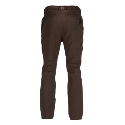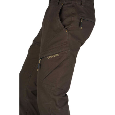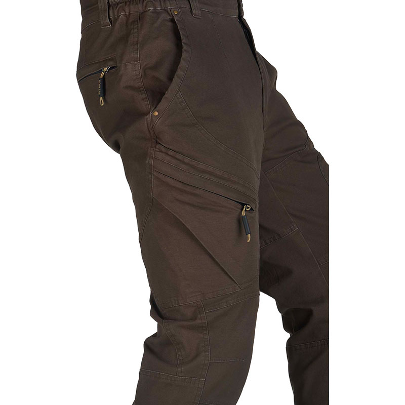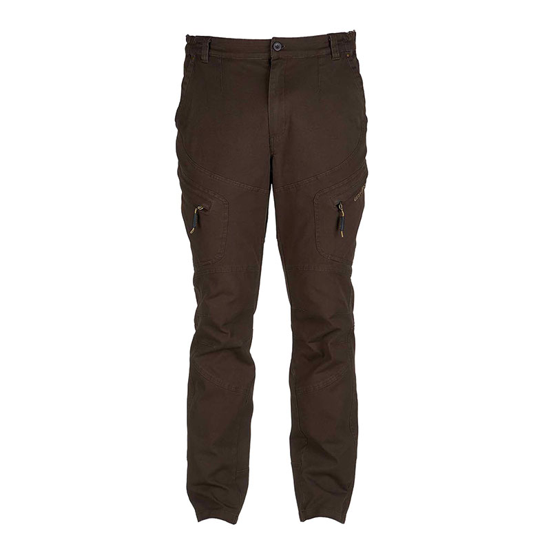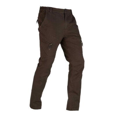 Pantalone da caccia SIENA, in robusto canvas di cotone elasticizzato. Due tasche frontali, due tasche laterali a soffietto con zip, due tasche posteriori con zip, elastico ai fianchi.