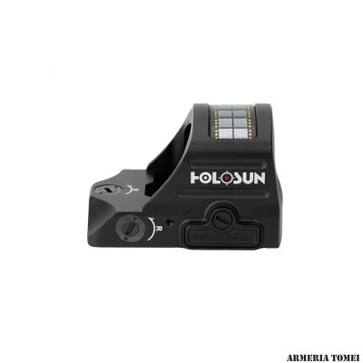 Micro reflex RED dot della gamma Holosun con taratura stabile e precisa di 1 MOA/click, impermeabile IP67, esente da parallasse, 12 livelli di luminosità per qualsiasi condizione ambientale, punto di mira occultato, pulsanti + e – per facilitare le fasi di impostazione dell’ottica senza ostruzione della visione, reticolo RED 8MOA circle open dot. Memorizza l’ultimo livello di luminosità utilizzato, che viene automaticamente re-impostato alla riaccensione, funzione di auto-spegnimento, sensore di movimento che gli permette di riattivarsi dallo “sleep-mode” ad ogni movimento dell’ottica, pannello solare “Solar Failsafe” che gli permette di alimentarsi anche senza l’ausilio delle batterie. Imposta automaticamente la luminosità del red dot in base alla quantità di luce presente nell’ambiente, è sufficiente una breve pressione del tasto “+” per tornare al funzionamento a batteria e regolazione intensità green dot manuale. Adatto al montaggio su pistola e specifico per tiro dinamico.