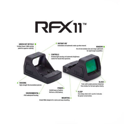 Il RFX 11 è l’ultimo nato di una lunga serie di dispositivi di puntamento ad alta visibilità, costruiti con precisione e pensati per l’uso pratico da Viridian. Le sue dimensioni ridotte lo rendono perfetto per pistole da porto occulto con slitta ottica o come mirino secondario su un fucile per tiri a corto raggio. Con un peso di soli 12,5 grammi, il RFX 11 è uno dei mirini reflex più leggeri sul mercato. Ricco di funzionalità – tra cui un visibilissimo punto verde da 3 MOA Viridian, tecnologia INSTANT-ON, spegnimento automatico, sensore di luce ambientale e oltre 30.000 ore di autonomia – il RFX 11 è un accessorio indispensabile per ogni tipo di arma da fuoco.
