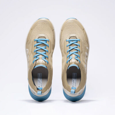 In fase di appoggio, il sottopiede di montaggio è inclinato verso l’esterno per assecondare l’appoggio del tallone. Nella zona esterna del tallone lo spessore ammortizzante è maggiore per assorbire l’impatto, mentre la zona anteriore interna della zeppa è composta da materiale ammortizzante per distribuire la forza di spinta. Il disegno asimmetrico del battistrada allineato con l’asse d’appoggio e il profilo sporgente aumentano la superficie di contatto.