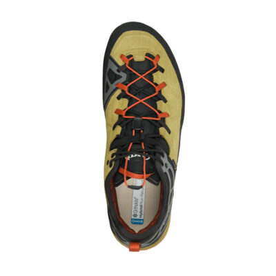 Calzatura da avvicinamento tecnico e climbing leggero, per vie ferrate ed escursioni su sentieri di montagna anche in presenza di pioggia. Evoluzione del modello Rock con miglioramenti tecnici di calzata. La tomaia in scamosciato, tessuto e microfibra resistente alle abrasioni è dotata di una protezione in gomma che avvolge e protegge la zeppa negli appoggi in arrampicata. Costruzione intersuola asimmetrica a doppia densità EVA e PU, adotta il sistema AKU Elica Natural Stride System per favorire l’efficienza biodinamica. Personalizzazione della calzata con il sistema a doppia allacciatura Dual Fit System che permette di adeguare il comfort e la precisione della calzata durante le diverse fasi di utilizzo: un laccio tradizionale per massima comodità durante l’avvicinamento ed un fast lacing per aumentare sensibilità e precisione in fase di arrampicata, anche sugli appoggi più piccoli. La suola Vibram Approcciosa con mescola Megagrip ad alte prestazioni fornisce il massimo grip con un design specifico per l’arrampicata.