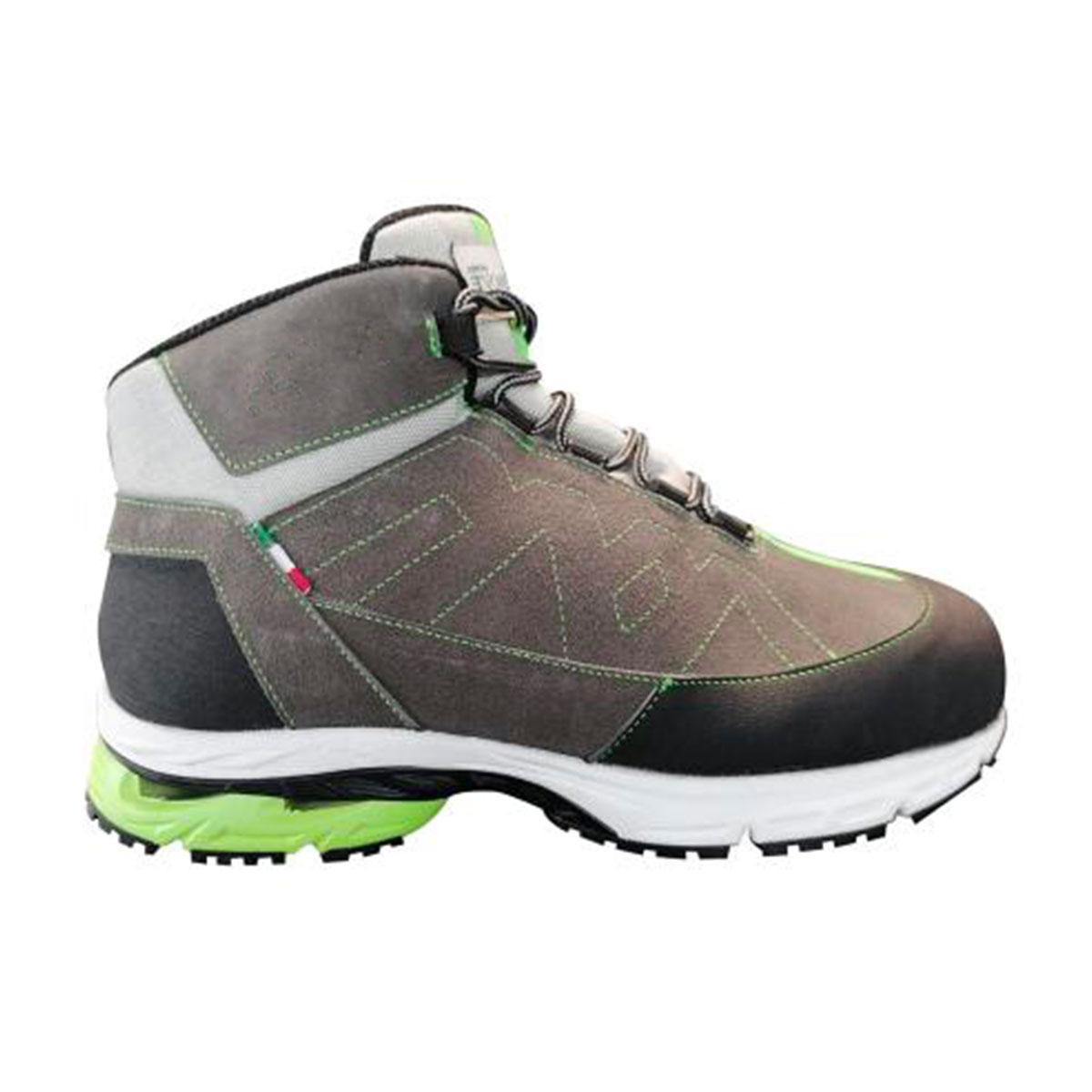 Calzatura alta tipo polacco con tomaia in pelle scamosciata ed inserti in cordura. Riporto antiusura su punta e tallone. Fodera in tessuto 3D Airent altamente traspirante e assorbente. Suola ENERGY SHIELD ultralight in doppio strato di phylon, stabilizzatore e battistrada in gomma, antistatica, antiscivolo. Puntale in Composit®, soletta antiperforazione tessile Kevlar. Lavorazione Ago.