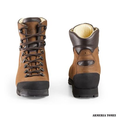 Scarponi da caccia e trekking in pelle nabuk smerigliata color marrone idrorepellente a taglio unico molto morbida.
