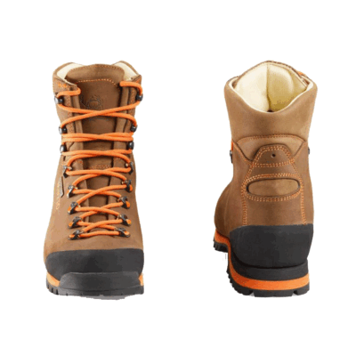 Scarponi da caccia e trekking Alta Visibilità, in pelle nabuk smerigliata color marrone idrorepellente a taglio unico.