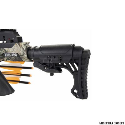 Il modello Skorpion XBC 420 ha una grande potenza, supportata da un sistema con cam in alluminio fresato. La comodità di utilizzo è migliorata dalla presenza del calcio regolabile in lunghezza (tra 91 e 99 cm di lunghezza totale) e dalla possibilità di regolare la posizione della guancetta e dell’appoggio per la mano in posizione centrale alla balestra. La sicurezza e la piacevolezza di tiro sono aumentate dal sistema anti dry fire che previene rilasci accidentali senza il dardo e da smorzatori di vibrazione a corda e sui flettenti sdoppiati. La faretra può essere montata in posizione laterale per non essere d’intralcio e per permettere di prendere un dardo velocemente.