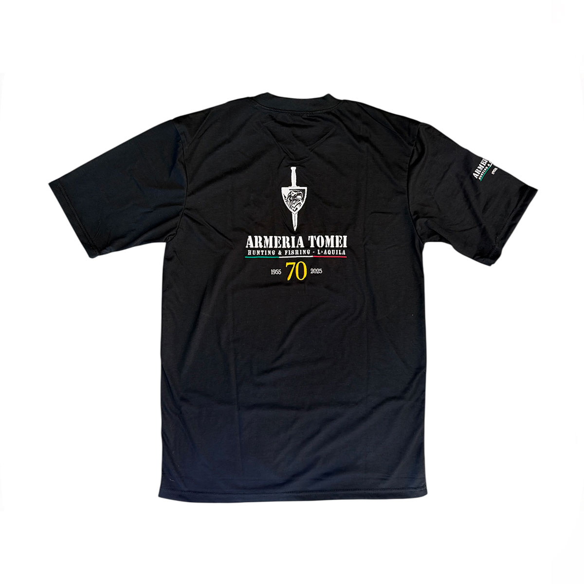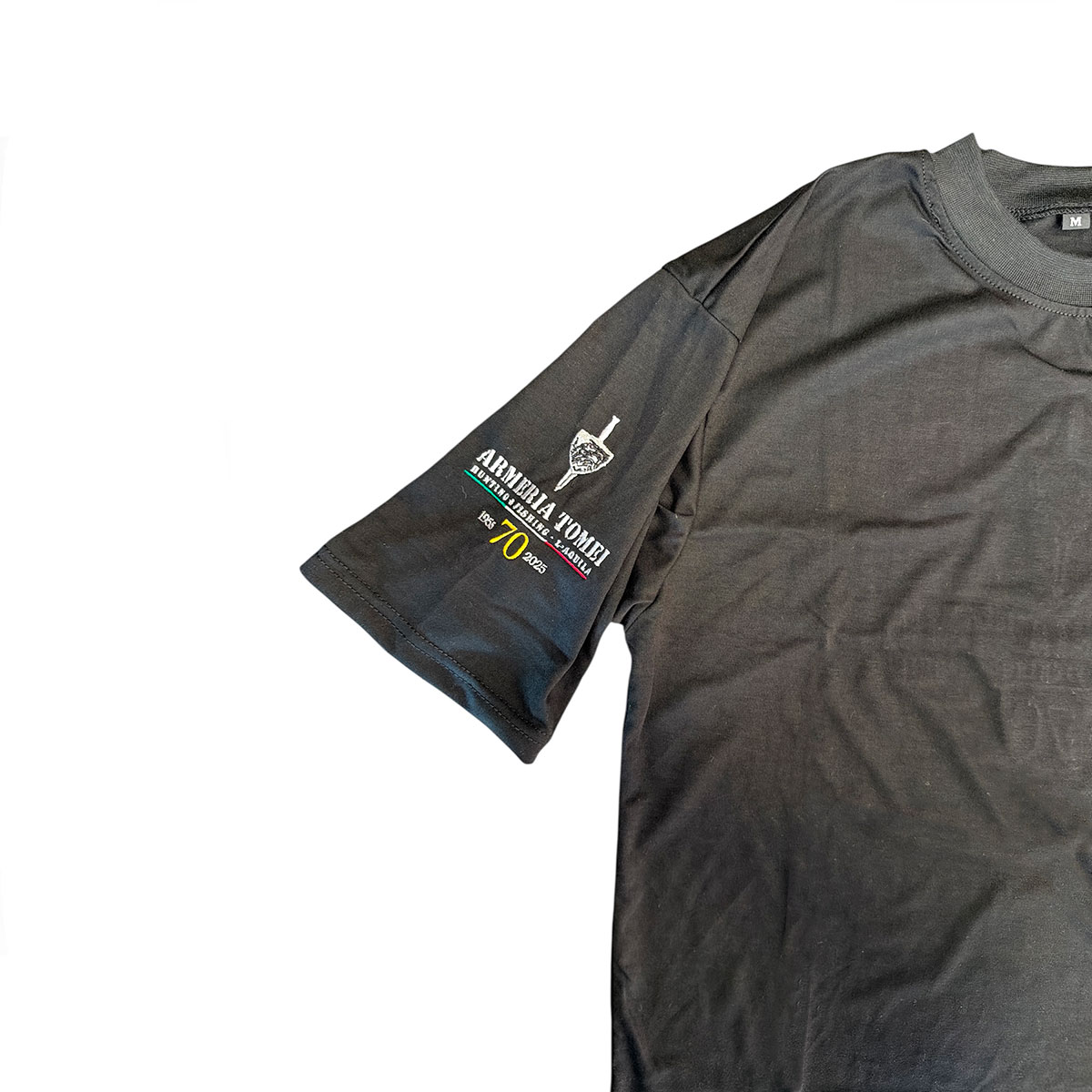 T-Shirt con logo della nostra armeria ricamato sul lato cuore. Manica destra con ricamo logo e sulla schiena, in grande, il logo sempre del 70° anniversario.
