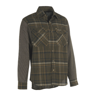 Camicia tecnica da caccia, in calda flanella di cotone con maniche interamente in tessuto Cordura® antistrappo. Due tasche al petto con pattina.