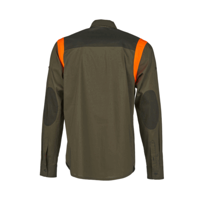 Camicia da caccia VALLEY in tessuto misto cotone elasticizzato con al petto doppia tasca con cerniera più doppia tasca con pattina. Inserti in tessuto arancione alta visibilità. Maniche avvolgibili.