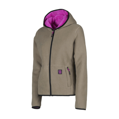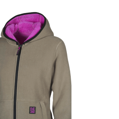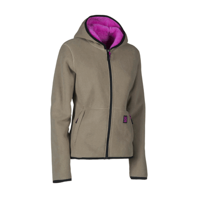Confortevole giacca reversibile adatta alle attività all’aperto, un lato in pile agnellato e un lato in pile rasato. Due tasche scaldamani e cappuccio.