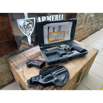 Revolver Ruger usato in perfette condizioni, completo di scatola e corredo originale. Inoltre comprende fondina in pelle Vega Holster e guancette di ricambio.
