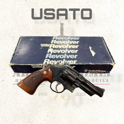 Revolver Smith & Wesson usato in perfette condizioni nonostante abbia più di quarant’anni. Guancette originali in legno con logo, brunitura nera originale lucida. Completo di scatola di cartone originale.