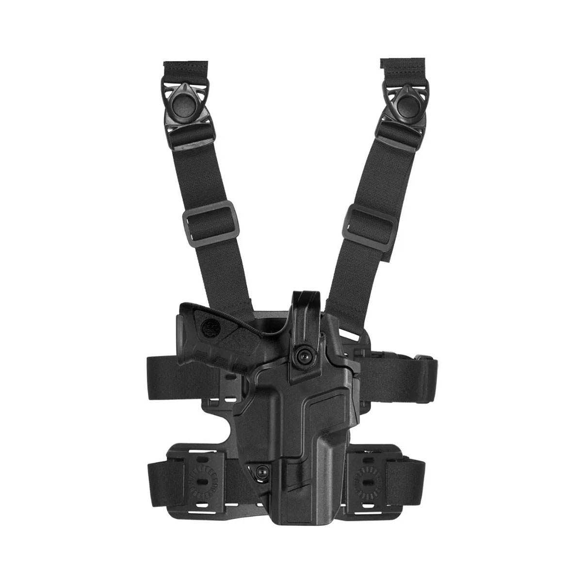 Con fibbia rotativa per facilitare il movimento, doppia fascia con binari antiscivolo per ancoraggio alla coscia.