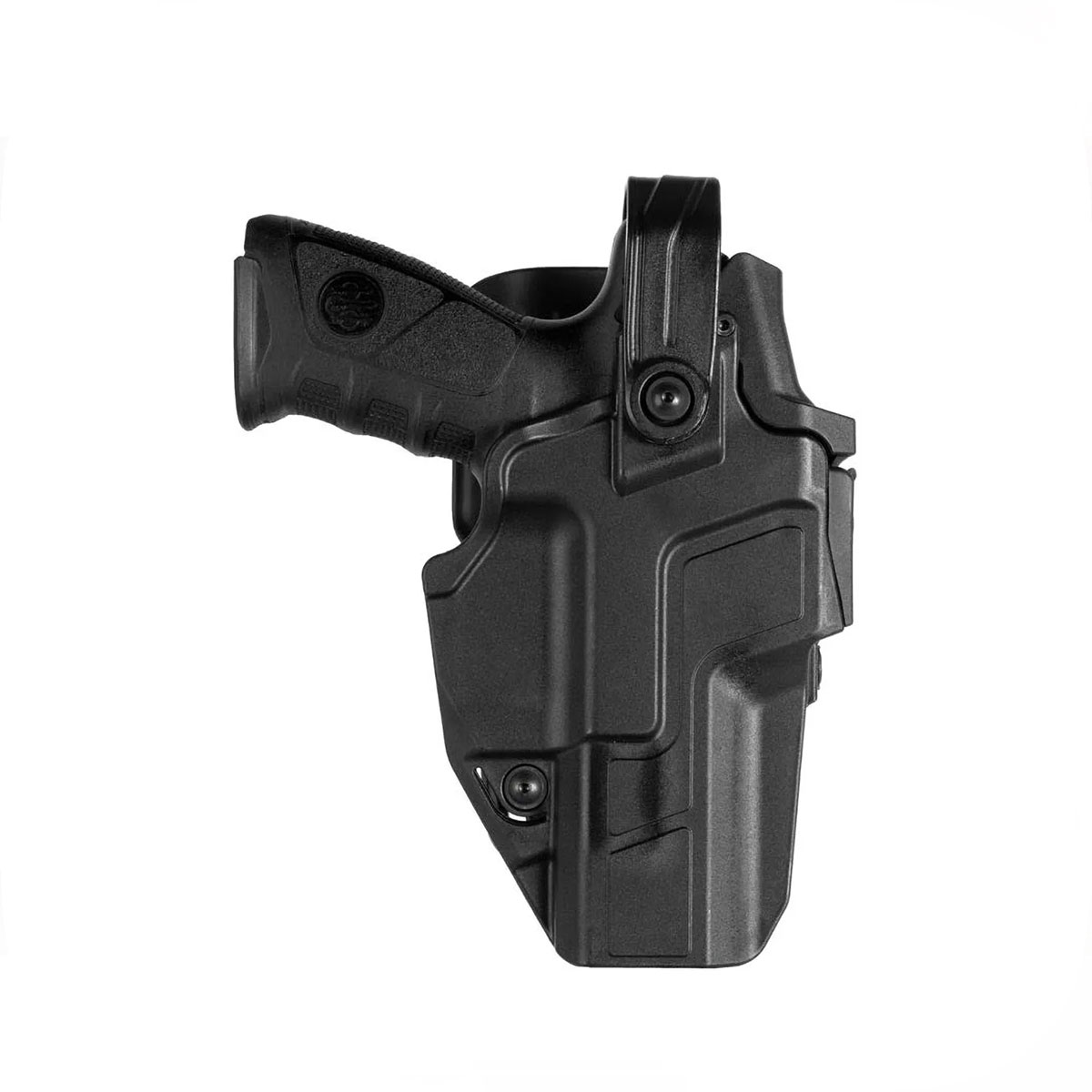 Sistema di sicurezza “Front Stop”, che agisce sul foro di espulsione, sganciabile tramite una leva posta nella parte interna della fondina, azionabile con il dito pollice in un movimento naturale posteriore.