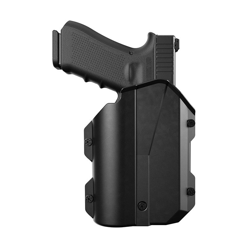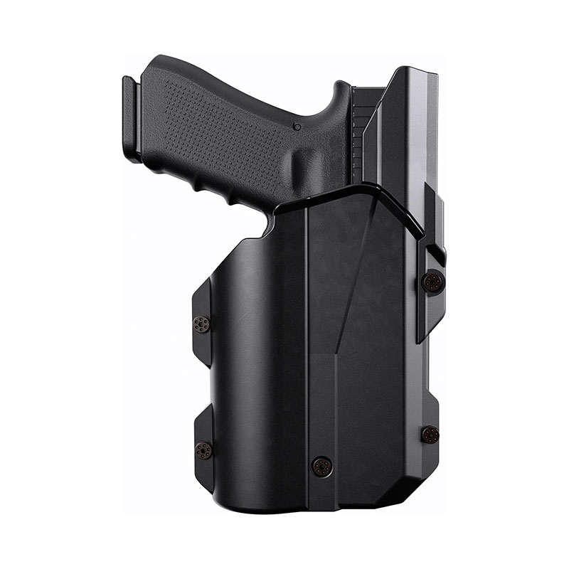 Fondina in polimero stampata ad iniezione con sistema di adattamento interno che permette la compatibilità con più tipologie di armi montate con svariate torce/laser.