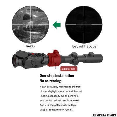 Il TA435 è il nuovo clip-on termico delle ditta Guide Sensmart. Può essere montato, grazie ad adattatori di varie misure, sulla campana delle tradizionali ottiche; oppure, può essere comodamente utilizzato come visore termico da osservazione. Grazie al peso e alle sue dimensioni piuttosto ridotte risulta essere un dispositivo pratico, leggero e maneggevole. Completamente impermeabile (IP67) e resistenete agli urti, è in grado di sopportare qualsiasi tipo di caccia, anche nelle condizioni più avverse. La lunghezza focale di 35mm e lo schermo OLED assicurano un’immagine sempre limpida, nitida e precisa del bersaglio; riuscendo ad individuare una fonte di calore fino a 2400m (un veicolo per esempio). Adattatore non incluso.