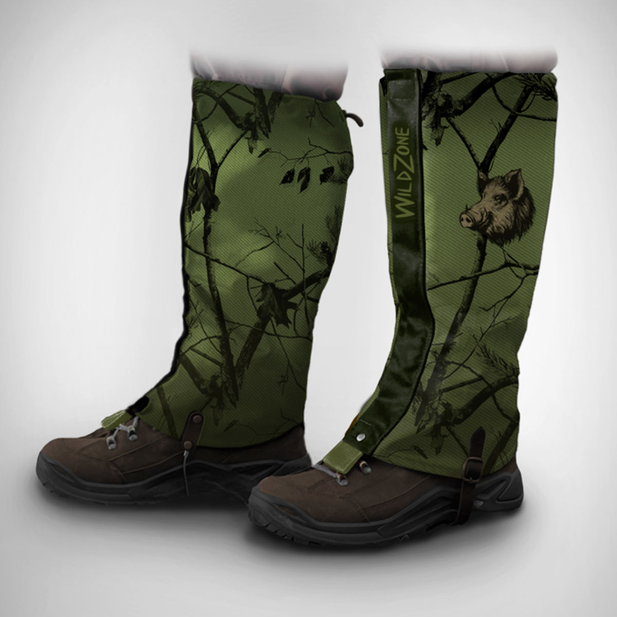 Ghetta impermeabile con chiusura tramite strap e cerniera, laccetto in acciaio regolabile. Stampa cinghiale. Disponibile verde e arancio.
